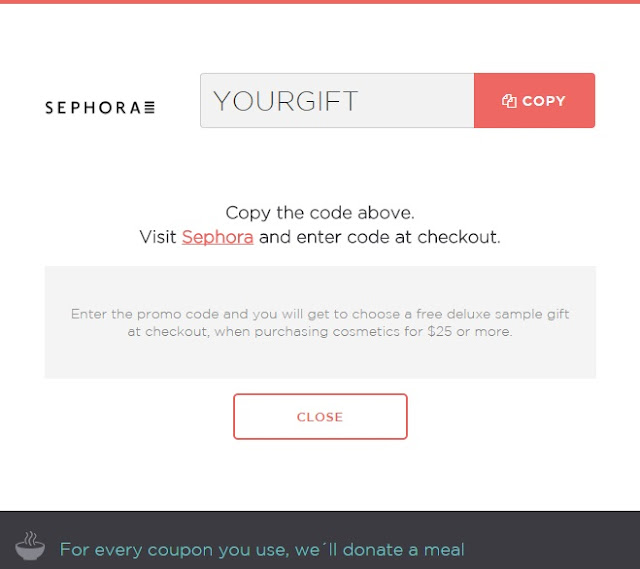 I clicked on close and chose a coupon deal that was good for me. In my case, it was a Free Mystery gift with a purchase of $25 or more. I copied my coupon code “YOURGIFT” and clicked on visit Sephora and shopped for the item I needed.