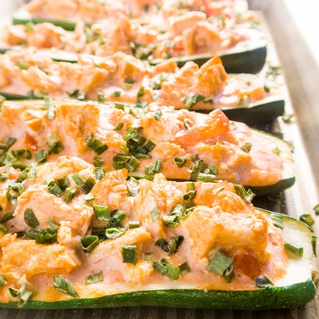 Buffalo Chicken Stuffed Zucchini Boats from Wholesome Yum